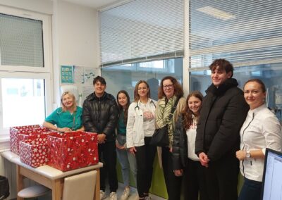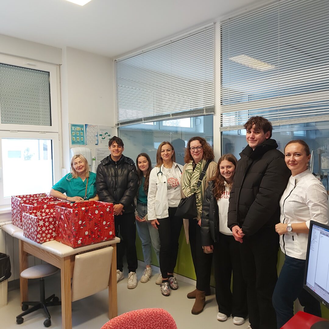 Nakon završetka akcije, učenici komercijalisti: Lukas Mihanović 4.k, Lana Ljubičić 3.k, Elena Brtan 3.k i Petar Mrnjec 3.k u pratnji nastavnice Ivane Gajski Berić, dipl.oec, 2. prosinca 2025. posjetili su odjel pedijatrije, gdje su uručili prikupljene slikovnice. Na odjelu su ih srdačno dočekale voditeljica odjela Dubravka Klobučar, dr.med. specijalist pedijatrije, glavna sestra odjela Anita Glavičić, bacc.med.tech., pomoćnica ravnatelja Slavica Konjević Pernar, dr. med. spec. oftalmologije i optometrije te medicinske sestre koje svakodnevno brinu o najmlađim pacijentima.
