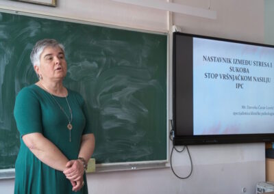 Tijekom predavanja nastavnici su imali priliku produbiti svoja znanja o vršnjačkom nasilju, s posebnim naglaskom na ulogu nastavnika kao svjedoka takvih situacija. Razmatrani su emocionalni doživljaji nastavnika u susretu s nasiljem među učenicima, kao i izazovi koje takve situacije nose u svakodnevnom radu.