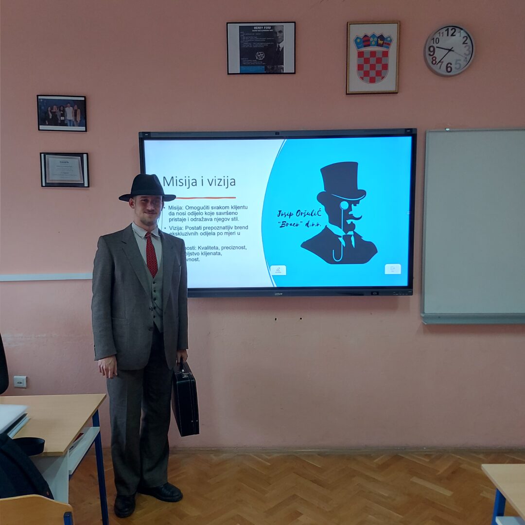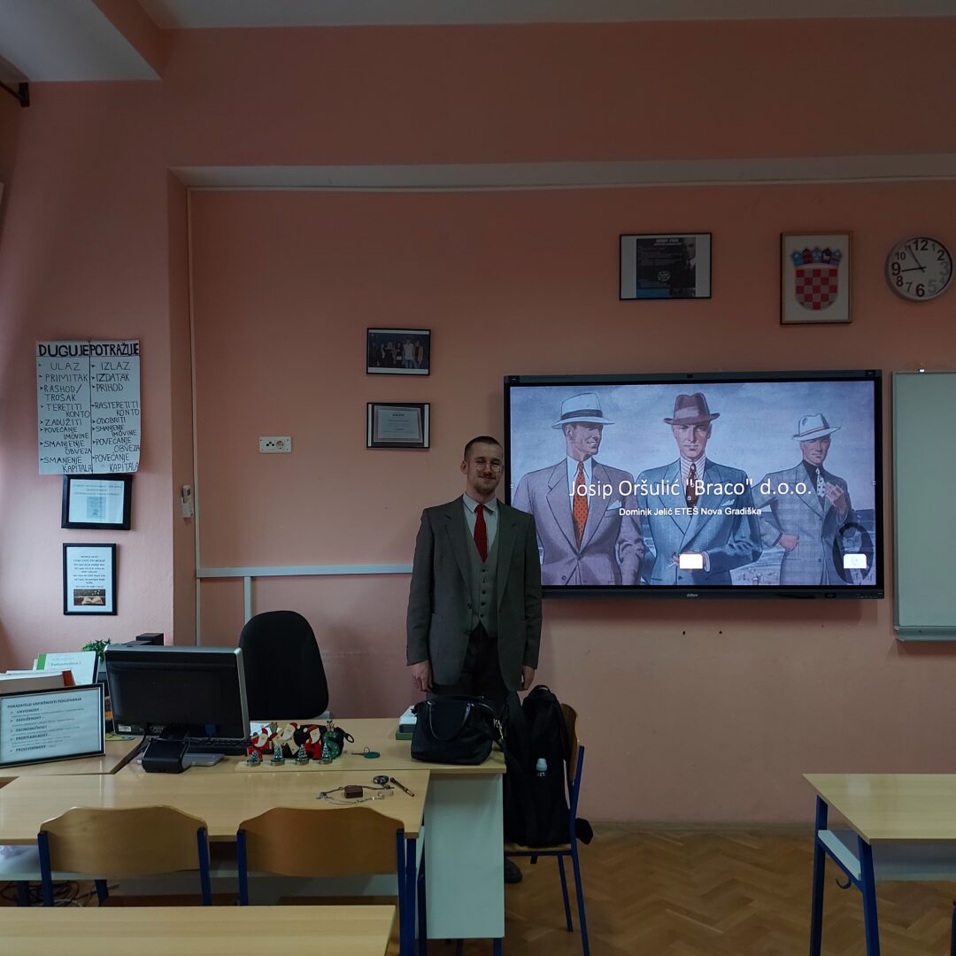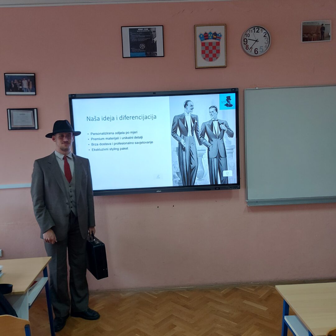 Posebno se istaknuo učenik Dominik Jelić, koji je prezentirao svoju poslovnu ideju: Prodaja muških poslovnih odijela – „Braco“ d.o.o.. Svoju prezentaciju dodatno je obogatio prikladnom odjevnom kombinacijom, čime je na zanimljiv i uvjerljiv način promovirao vlastiti koncept i pokazao profesionalan pristup zadatku.