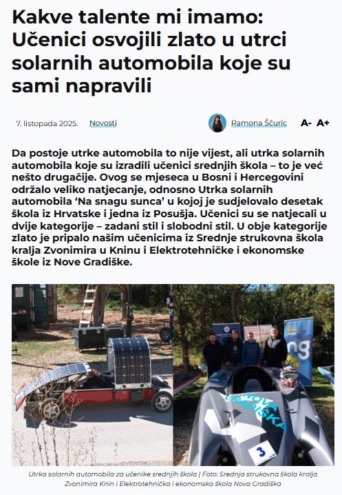 Pročitajte članak portala srednja.hr o utrci solarnih automobila u Parku prirode Blidinje u kojoj je naša ekipa osvojila prvo mjesto.